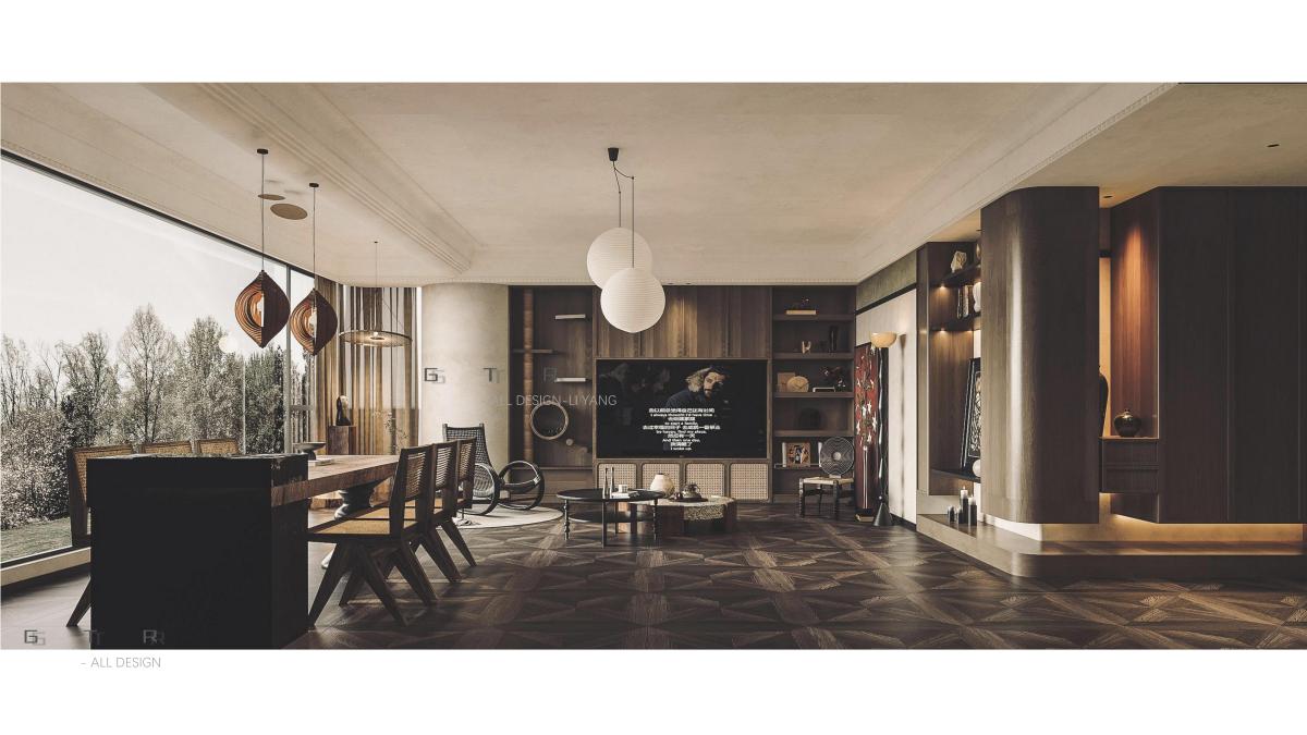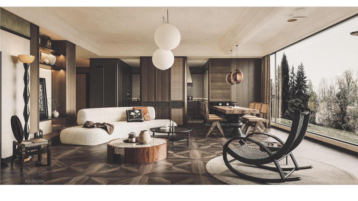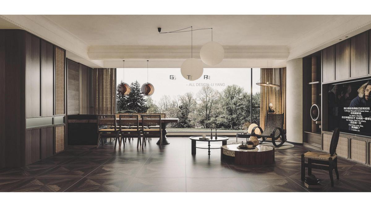 深色棕榈纹地砖铺陈出浓郁的热带风情,与同色系柚木电视柜、藤编茶几形成和谐的空间对话。整面落地窗将天光尽数邀入,两个白色球形吊灯如月亮般悬浮空中。光影流转间,仿佛置身南洋殖民时期的度假别墅。