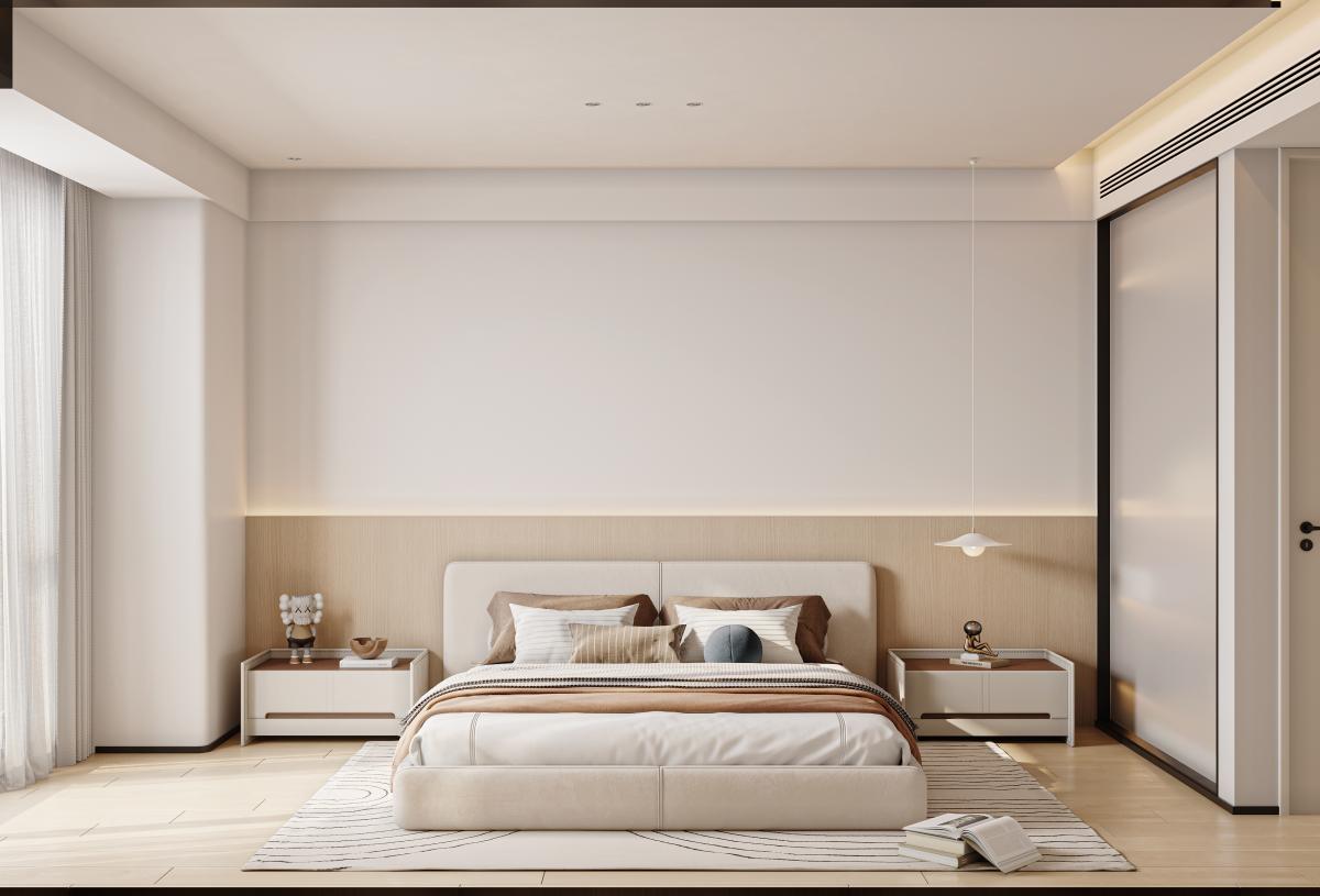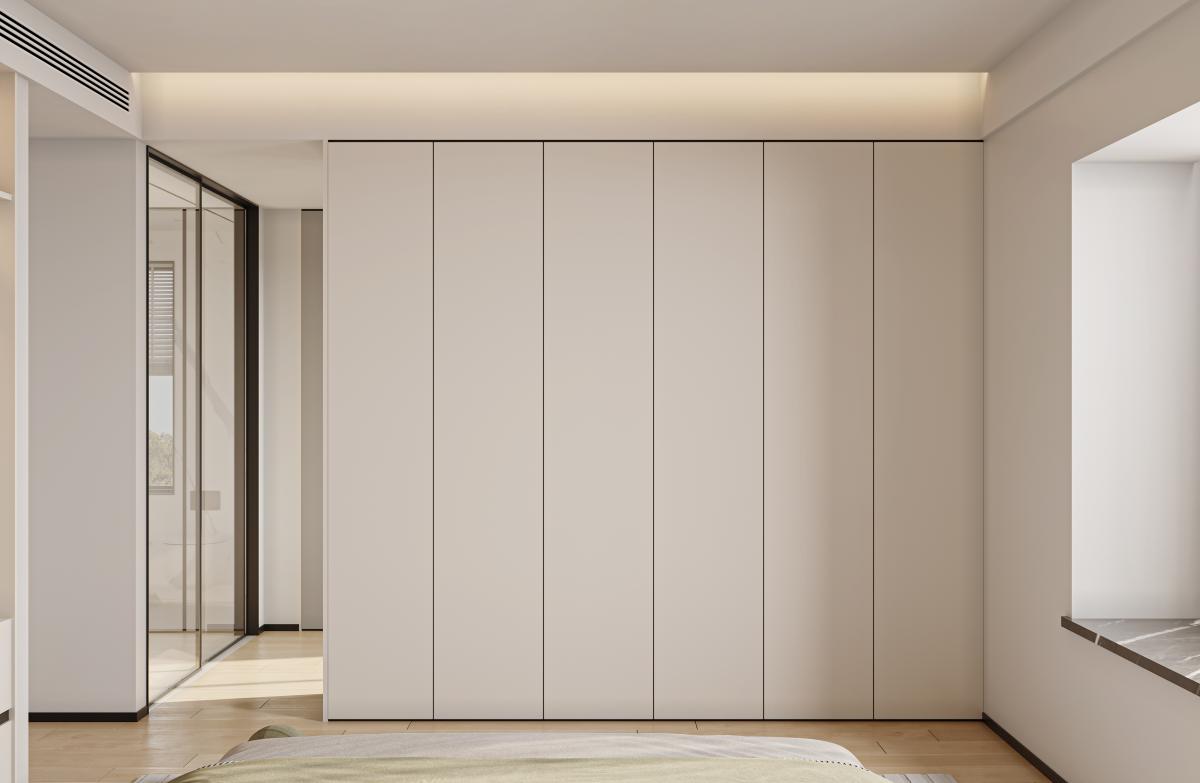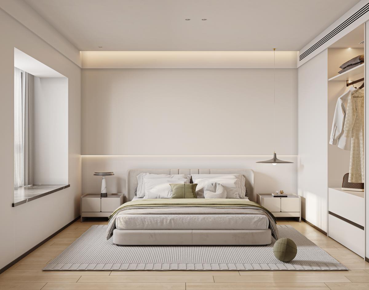 主卧以素色微水泥构筑静谧基调。床头线性灯带提供无眩光照明,通顶衣柜满足四季收纳。