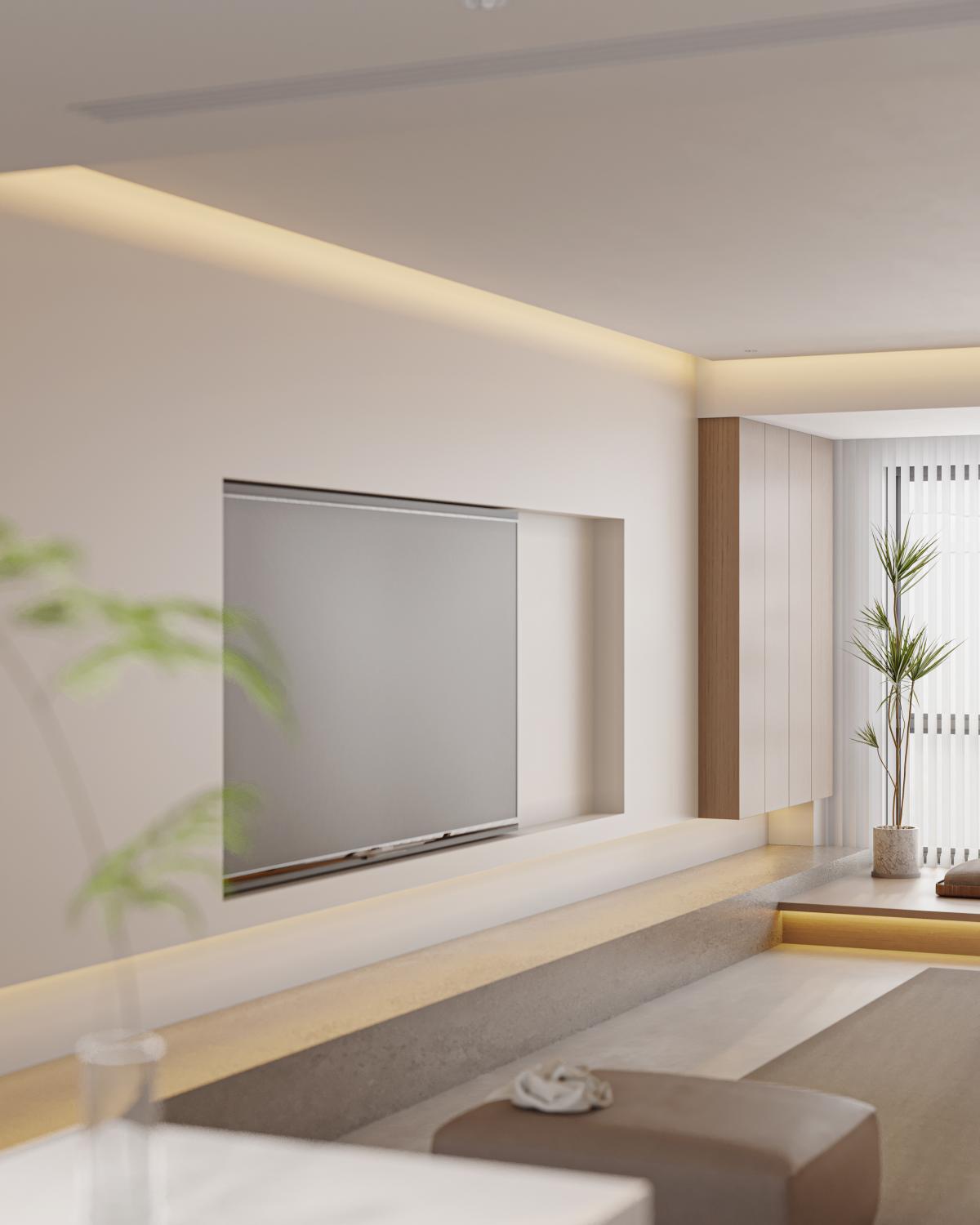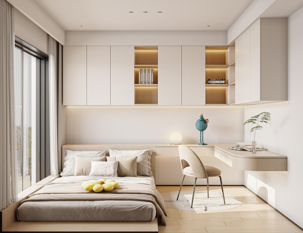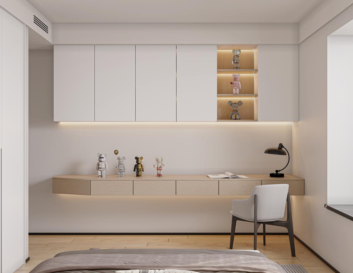 主卧以素色微水泥构筑静谧基调。床头线性灯带提供无眩光照明,通顶衣柜满足四季收纳。