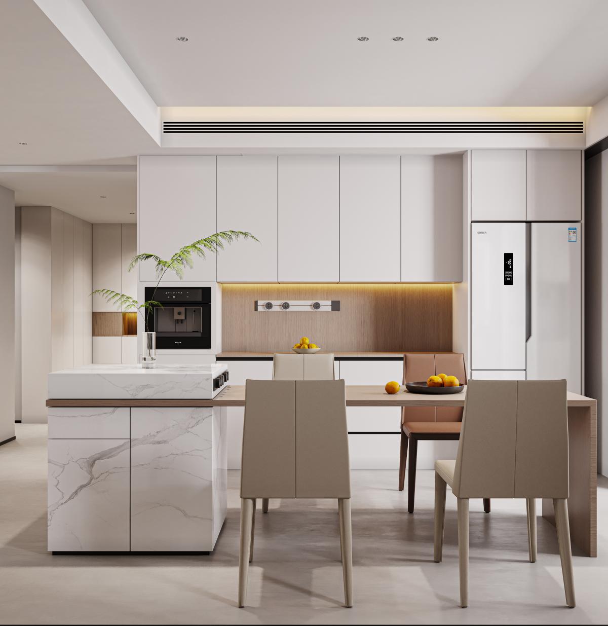 餐厅与客厅贯通一体,岩板长桌既是用餐区也是亲子手工台。整面餐边柜巧妙收纳餐具与小家电,保持台面整洁。晨光透过纱帘,这里记录着早餐时分的温馨对话。