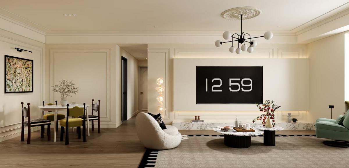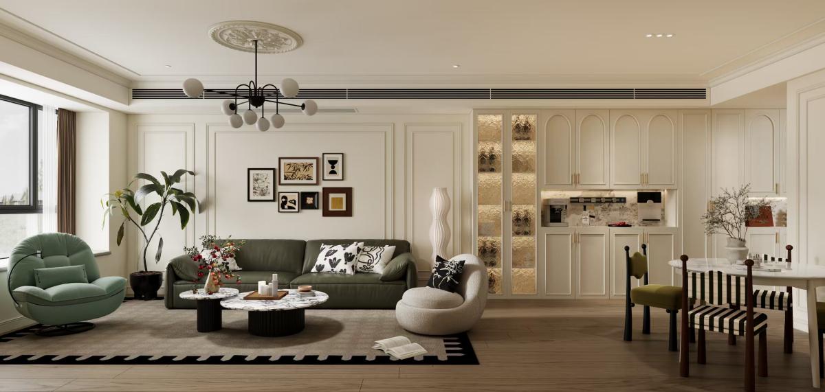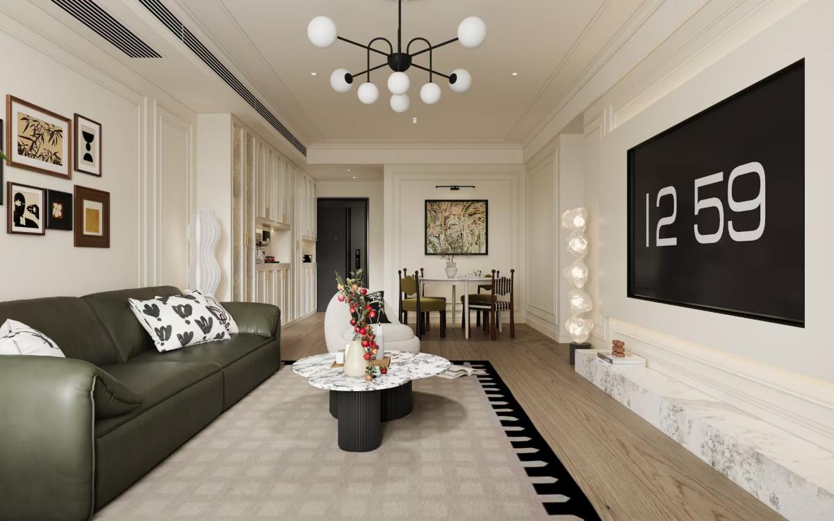墨绿色丝绒沙发在浅色木地板上如绿宝石般夺目,地毯上的繁复花纹与墙面的复古挂画轻声呼应。电视机屏幕只显示着精致的时间界面,取代了传统电视墙的杂乱。周末午后,陷在沙发里小憩,感受时光在指间温柔流淌。