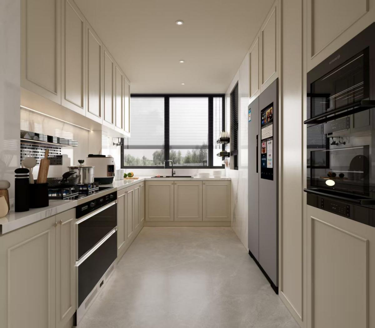 流畅的U型布局让烹饪过程成为一种享受,所有操作都在转身之间完成。白色橱柜与深色家电勾勒出简约的轮廓,台面上只保留最常用的器具。清晨的阳光透过窗户,照亮这个充满效率与美感的空间,在这里准备早餐成为一天中最惬意的仪式。