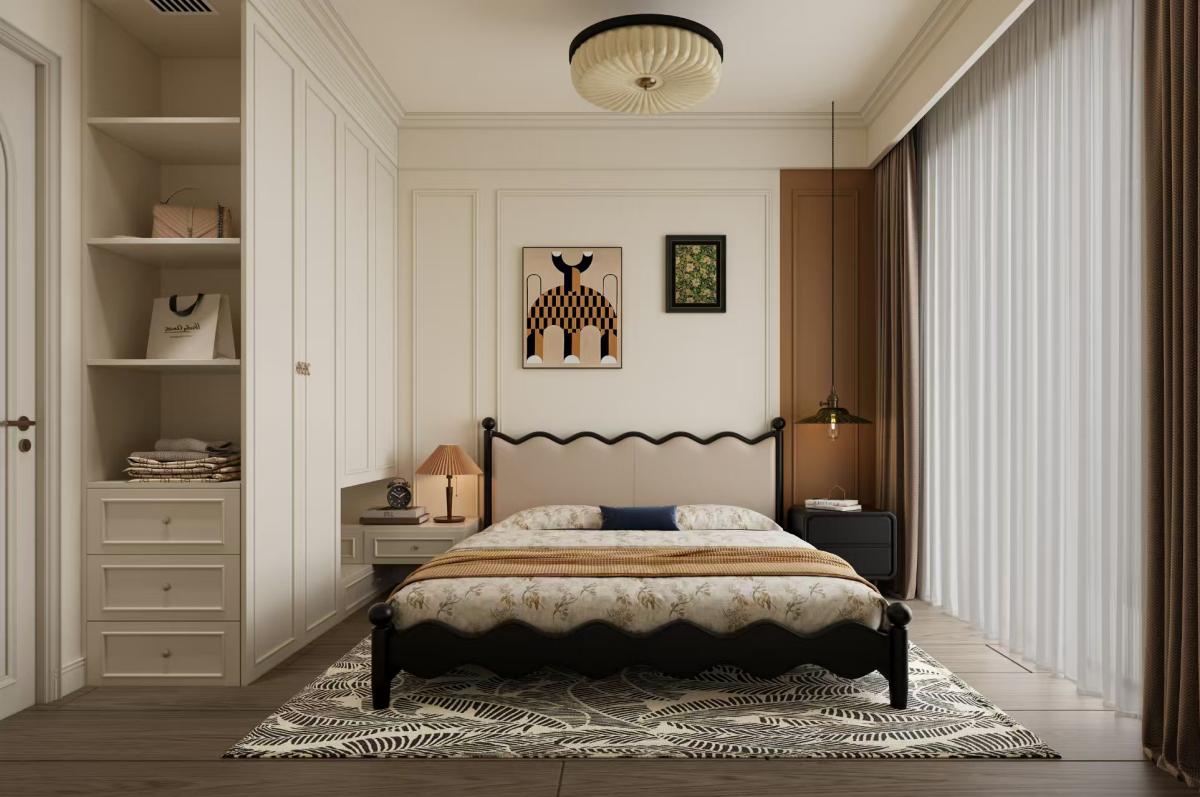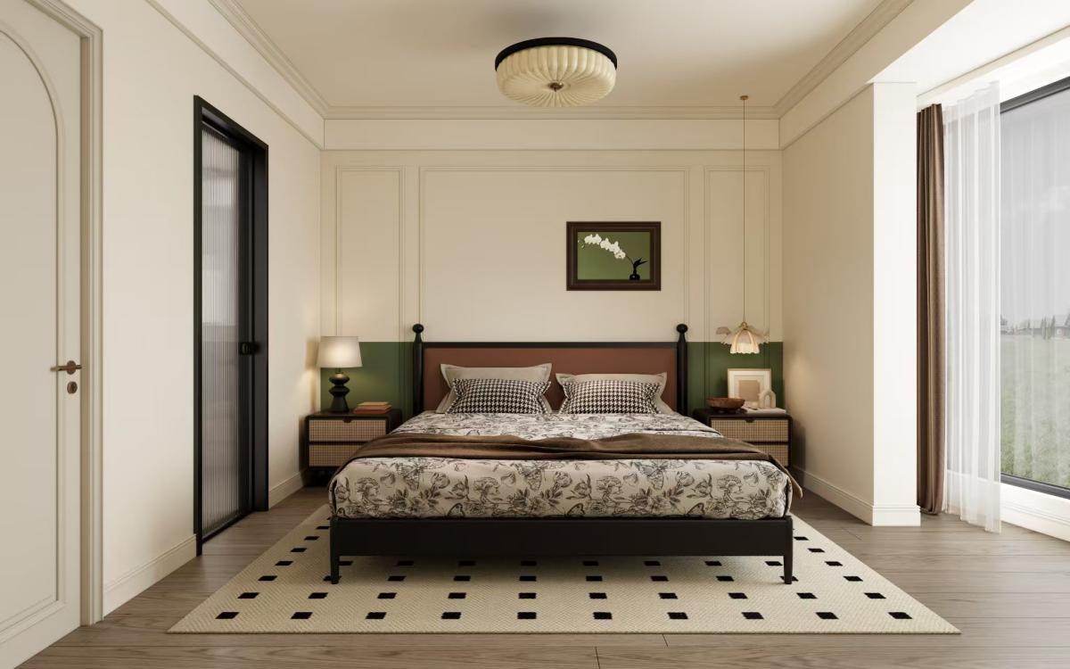 深浅交织的木色地板上,一方柔软地毯界定出休憩区的边界。床体以沉稳的深色为基调,搭配墨绿色床屏,与整体空间形成优雅对比。床头两侧的台灯与顶部的主灯共同构筑起温暖的光影系统,当灯光亮起,墙面便浮现出柔美的光斑,为私密空间注入艺术气息。