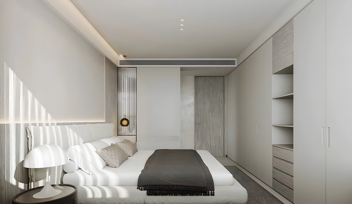 主卧室通刷奶茶色,营造温馨舒适的基调。衣柜的柜体与墙漆使用的同色系,让空间氛围达成一致。床头的背景墙采用了低饱和度的木饰面内嵌入灯带,使整体看上去更有设计感。