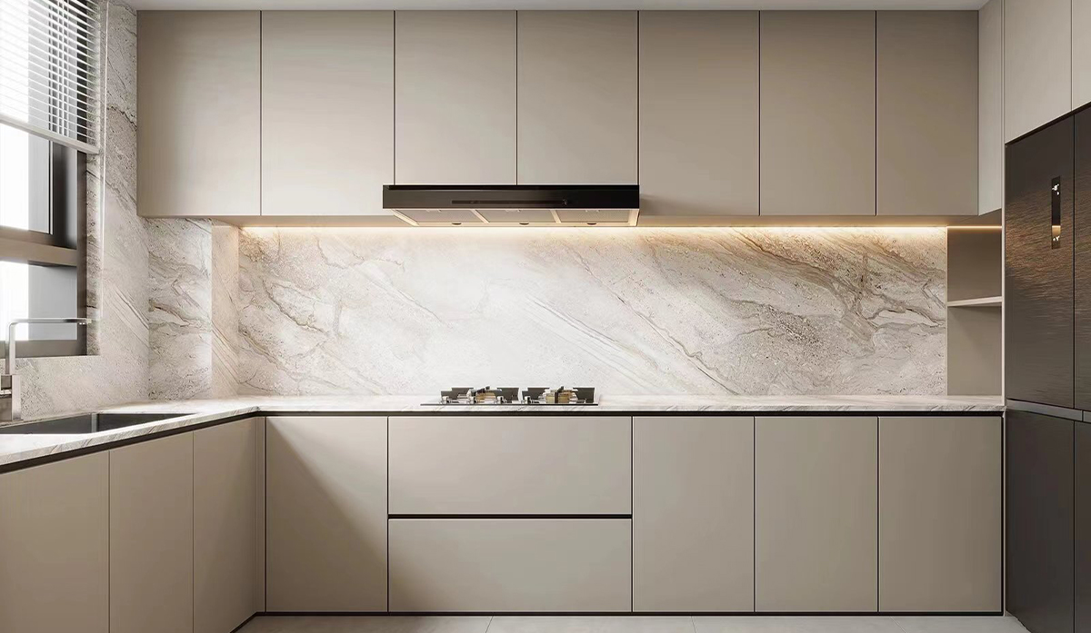 厨房奶咖色的橱柜搭配浅色系的大理石纹背板,颜色相呼应,显得时尚又优雅,厨房家电内嵌入厨柜内,让整个厨房空间干净通透。