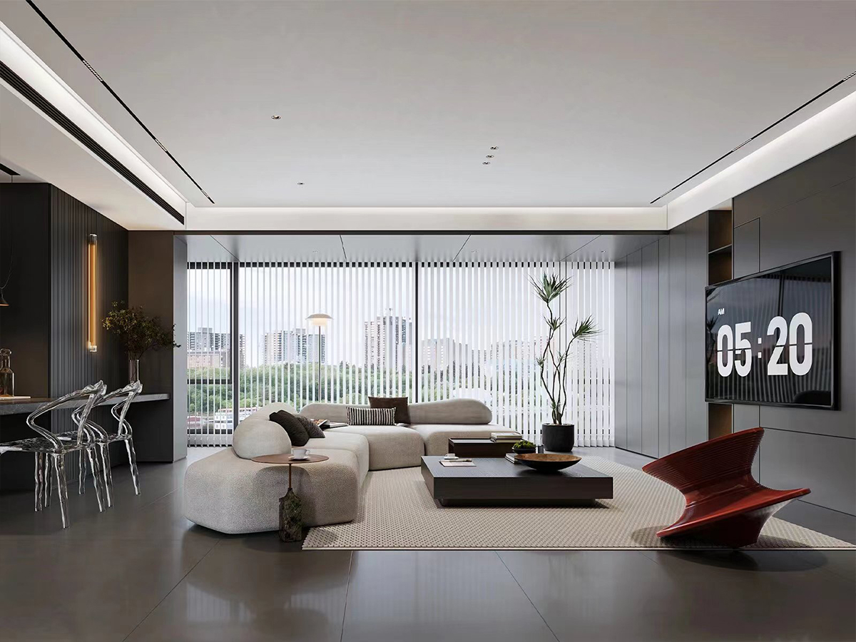 客厅整体空间用深色系做主要配色搭配,软装搭配上浅灰色的L形沙发做点缀,丰富整体空间的色彩,地砖也是采用了深色调的瓷砖通铺,整体给人一种神秘的高级感。