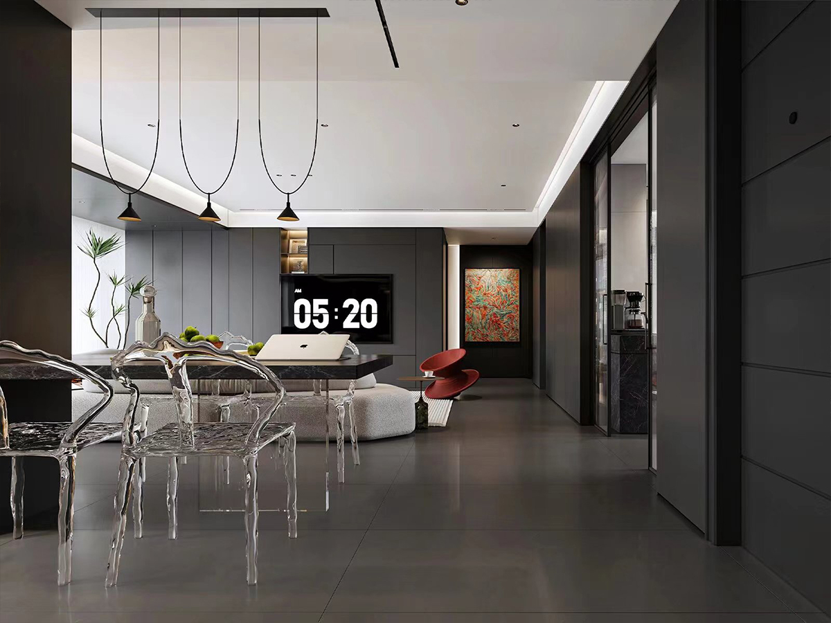 客餐厅区域相连接的设计,使在闲暇之余也可以坐在餐厅那边办公,深色的餐桌搭配上几把透明的餐椅点缀增加其整体的质感和氛围。。