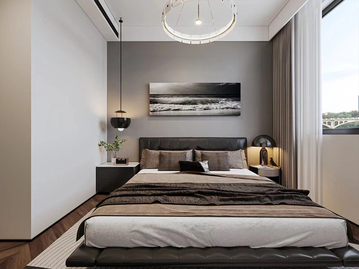 次卧室床头背景用灰咖色做搭配,墙上搭配一幅艺术画来丰富整体的画面感,再搭配上圆形的艺术吊灯做装饰搭配,整体看上去温馨又高级。