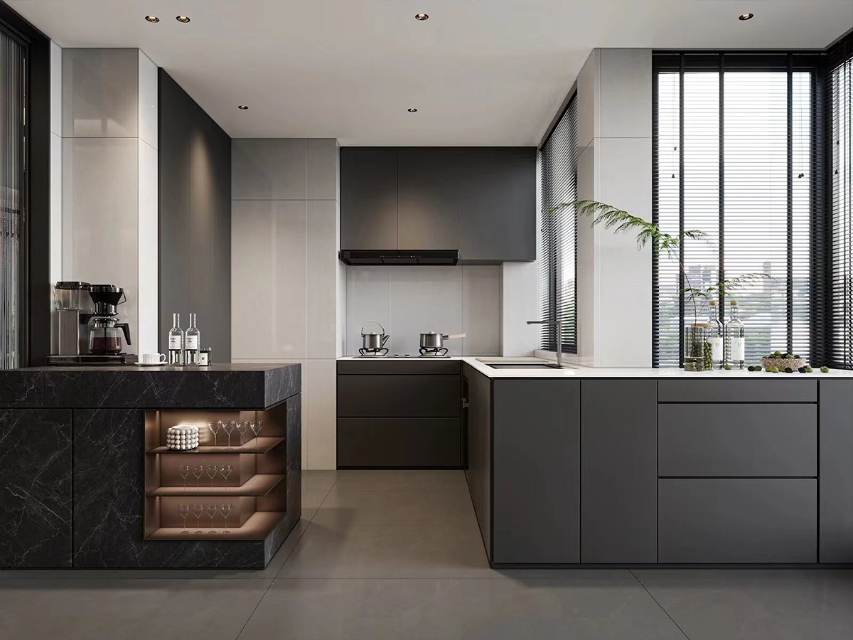 开放式的厨房设计,使厨房的空间最大化的得到利用橱柜也是延续了客厅整体的深浅色搭配来增加整体的色彩层次感。