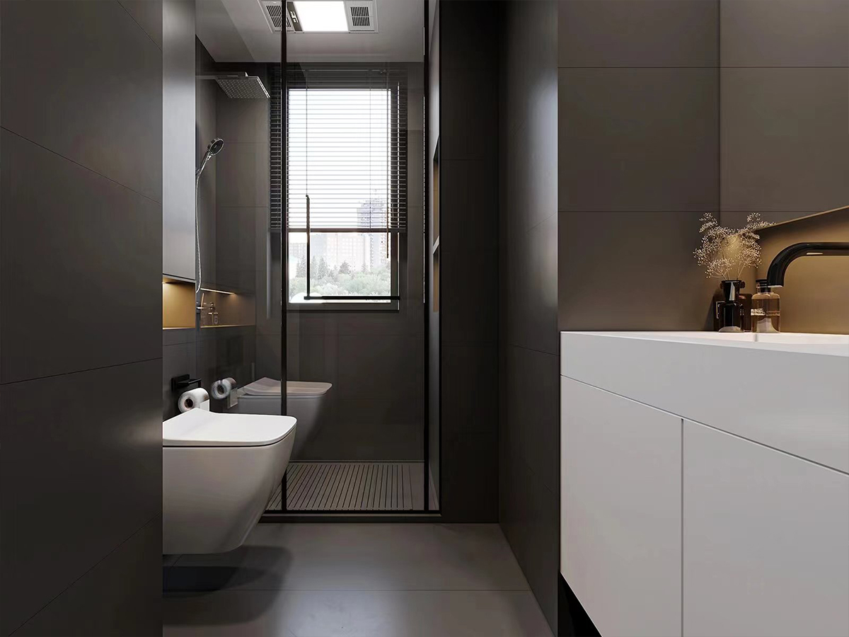 卫生间的主体颜色续用了客厅的高级灰,透明的淋浴房不会影响整个卫生间的采光,通过自然光的协调,使得卫生间整体上更加具有质感。